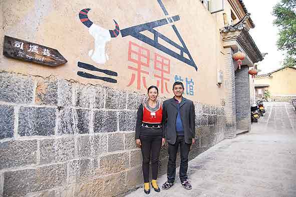 ▲2020年12月31日,中寨司莫拉佤族村村民李發(fā)果和丈夫在自家經(jīng)營的旅館前。新華社記者林碧鋒攝