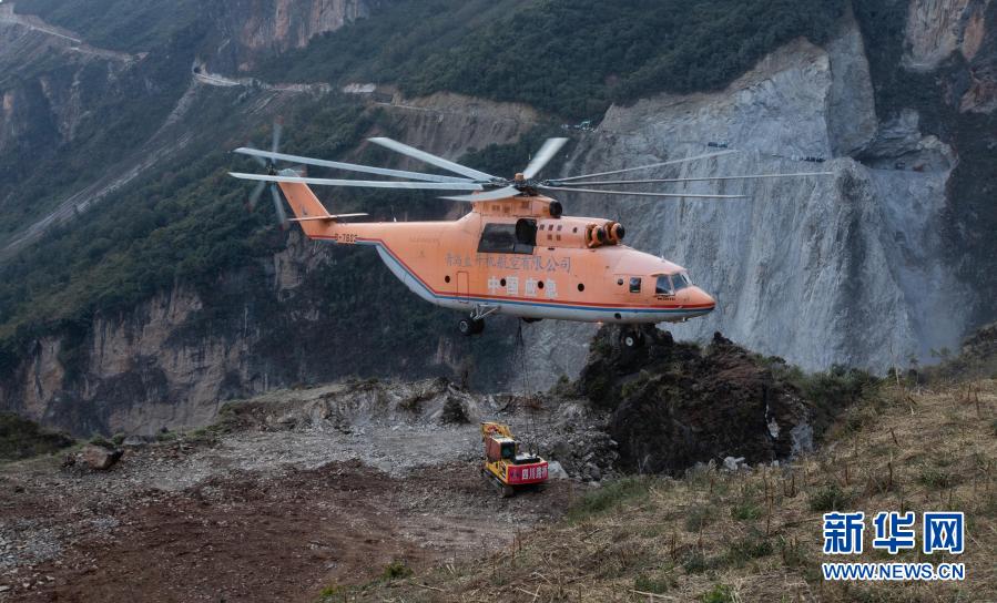 米-26重型直升機吊運一臺挖掘機抵達四川省布拖縣阿布洛哈村上空準備降落(2019年12月5日攝)。為了打通四川省布拖縣阿布洛哈通村公路,施工單位租用的一架米-26重型直升機克服高山峽谷、天氣多變等不利因素,從布拖縣城吊運大型施工設備到阿布洛哈村,為兩邊分頭掘進施工提供大型機械保障。新華社記者 江宏景 攝