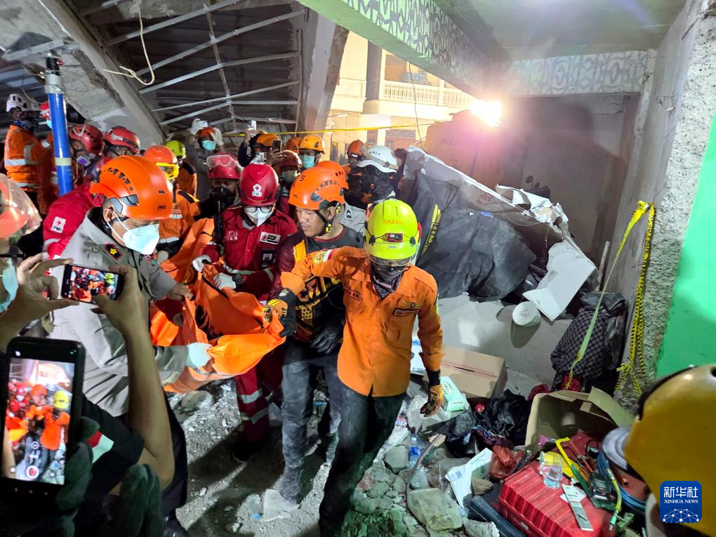 10月1日,救援人员在印度尼西亚东爪哇省诗都阿佐县建筑倒塌现场救出一名幸存者。新华社发(印尼国家搜救局供图)