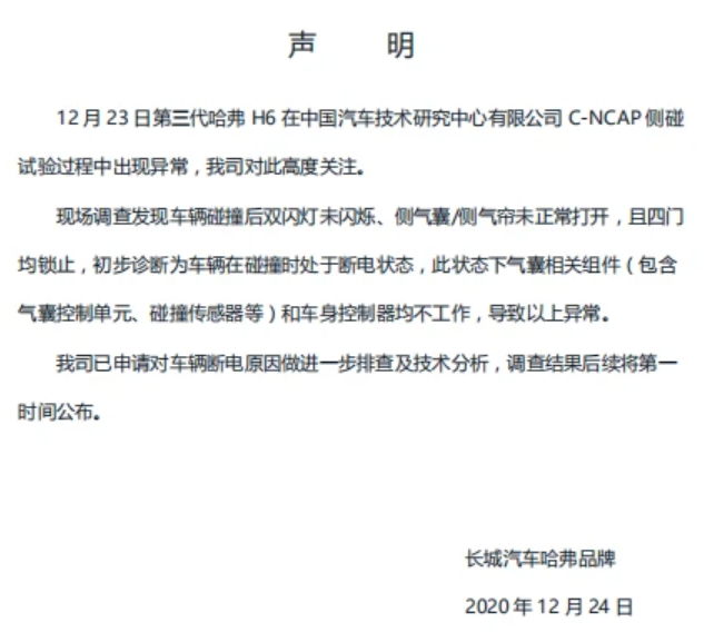 针对此碰撞结果,长城汽车给出了官方声明,称初步诊断为车辆在碰撞时处于断电状态,导致以上异常。具体内容如下: