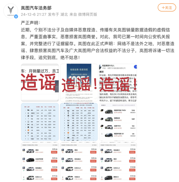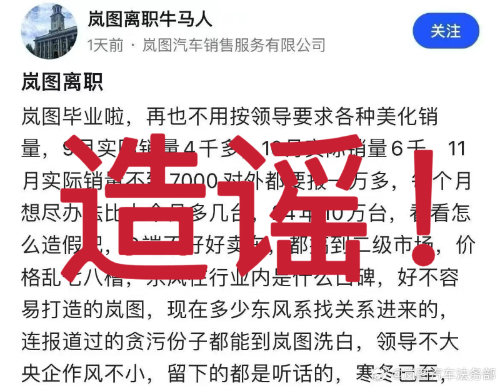 12月6日晚,岚图汽车法务部通过社交媒体发布声明,就网传信息进行辟谣。