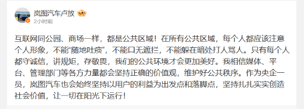7日,岚图汽车CEO卢放通过社交媒体表示,“互联网同公园、商场一样,都是公共区域!在所有公共区域,每个人都应该注意个人形象,不能口无遮拦,不能躲在暗处打人骂人。只有每个人都守诚信,讲规矩,存敬畏,我们的公共环境才会更加美好。”“作为央企一员,岚图汽车也会始终坚持以用户的利益为出发点和落脚点,坚持扎扎实实创造社会价值,让一切在阳光下运行!”
