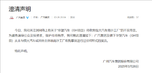 今日,我司关注到网络上有关于“华望汽车(GH项目)将收购恒大汽车南沙工厂”的不实传言。为避免误导公众及投资者,维护市场秩序,我司就此澄清如下:广汽集团及旗下华望汽车(GH项目)从未与恒大汽车或其他主体就南沙工厂收购事宜进行过任何形式的接洽。