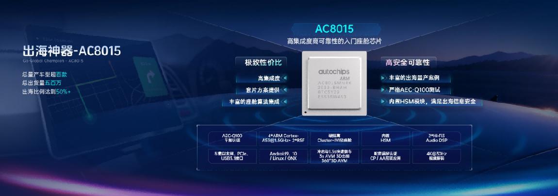 AC8015/AC8025座舱域控成为出海战略的“技术锚点”。这套方案不仅实现成本优化10%-20%,更以“一套硬件兼容全球”的理念,破解了车企出海面临的区域适配难题。