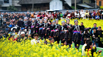 3月16日,在新西兰奥克兰举行的新西兰中国儿童文化日活动上,一名游客与身穿中国少数民族传统服饰的工作人员合影。