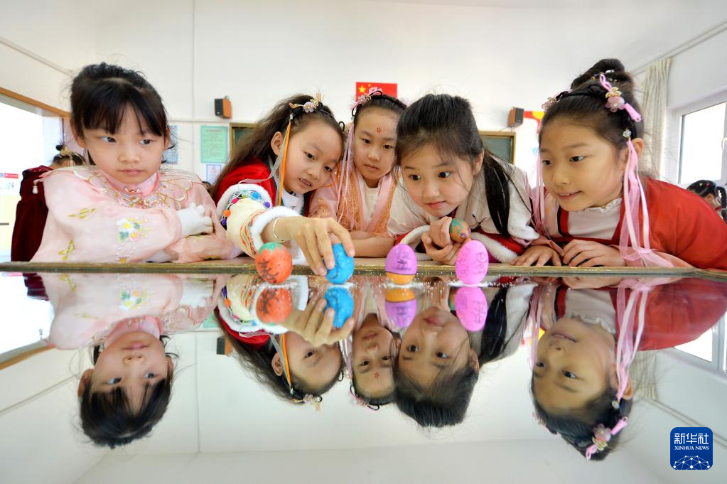 3月20日,在江苏省扬州市江都区育才幼儿园,小朋友们体验“立蛋”习俗。