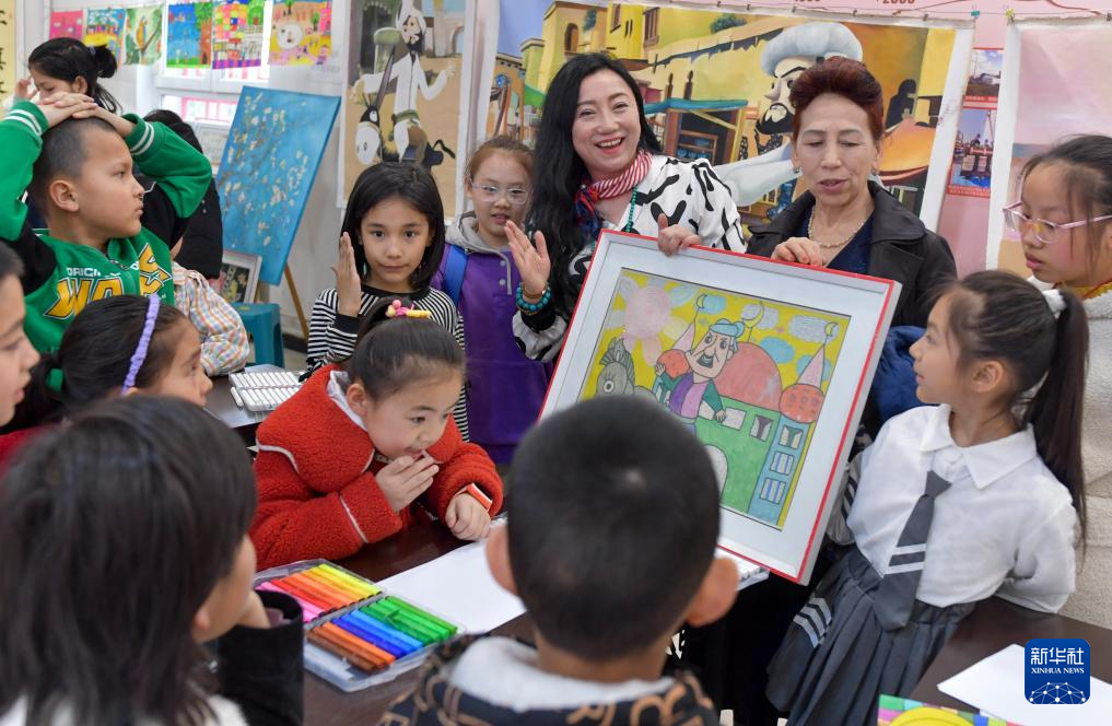 在乌鲁木齐市水磨沟区苇湖梁片区立井南社区,小朋友在公益美术课上学习绘画(3月22日摄)。