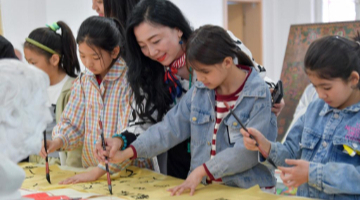 3月25日,在山东青岛北山小学开展的“艺术青岛·李沧有戏”主题活动中,柳腔演员指导学生戏曲动作。