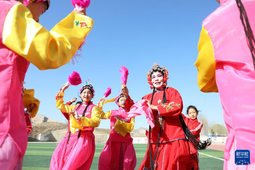 3月25日,在河北省唐山市丰润区泉河头镇团山子小学,评剧演员在教学生戏曲动作。