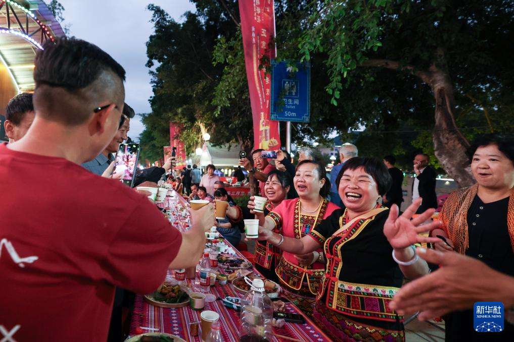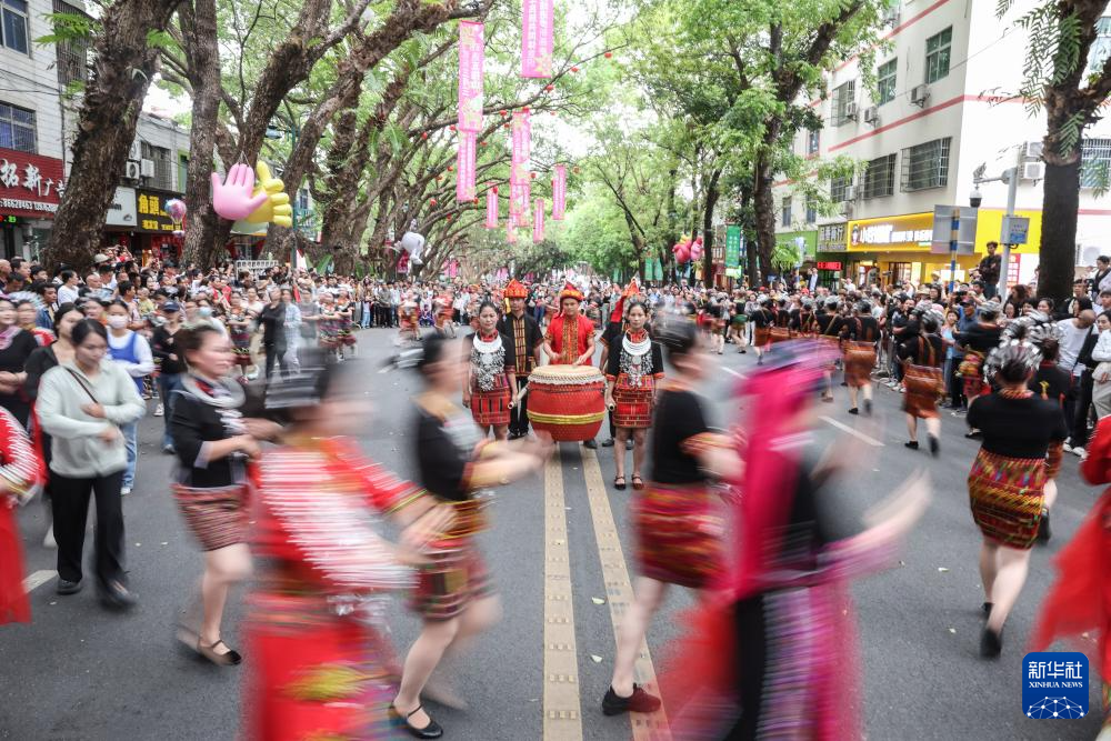 当日,2025海南黎族苗族传统节日“三月三”主会场活动在海南五指山市举行。当地举办了形式多样的民俗活动庆祝佳节,游客可以在五指山市观看“村秀”、竹竿舞等表演,还可以体验长桌宴特色美食。