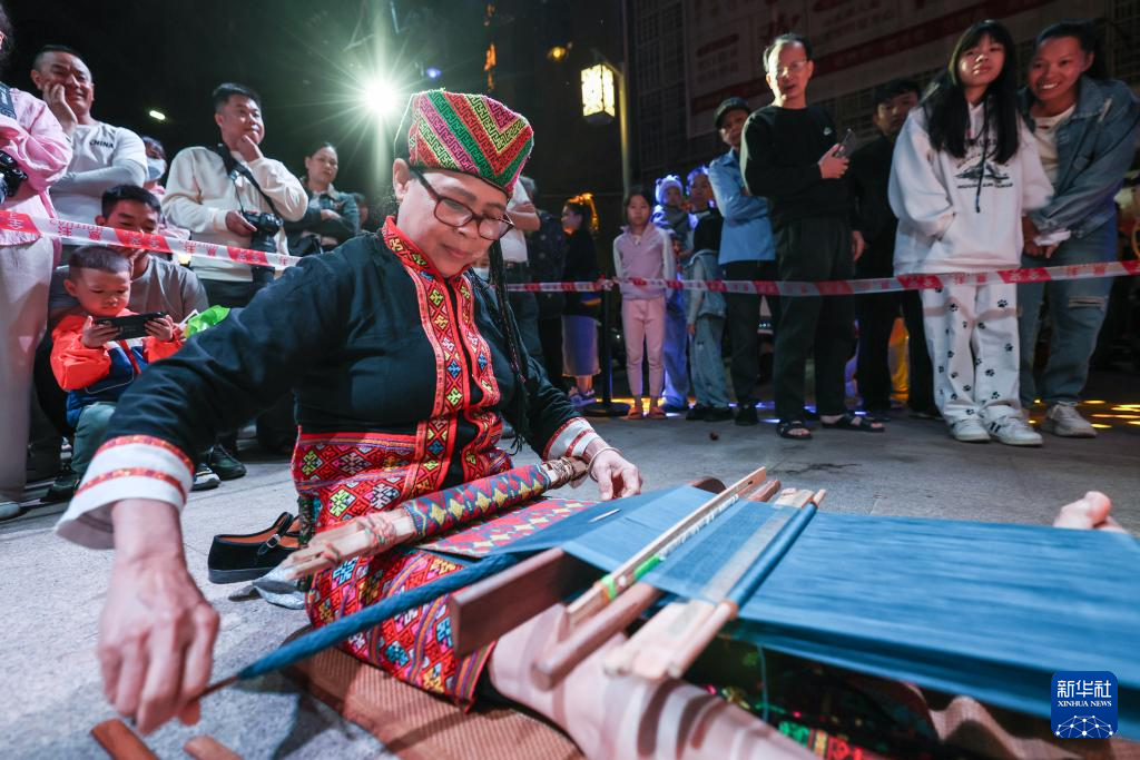 3月30日,非遗传承人在活动现场表演织黎锦。