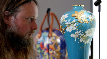 永庆坊一家活字印刷店店主赖朝阳展示自己的活字印刷作品(5月13日摄)。