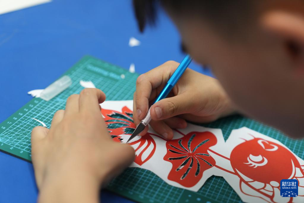 5月21日,学生在吉首市芙蓉学校学习踏虎凿花(剪纸)技艺。