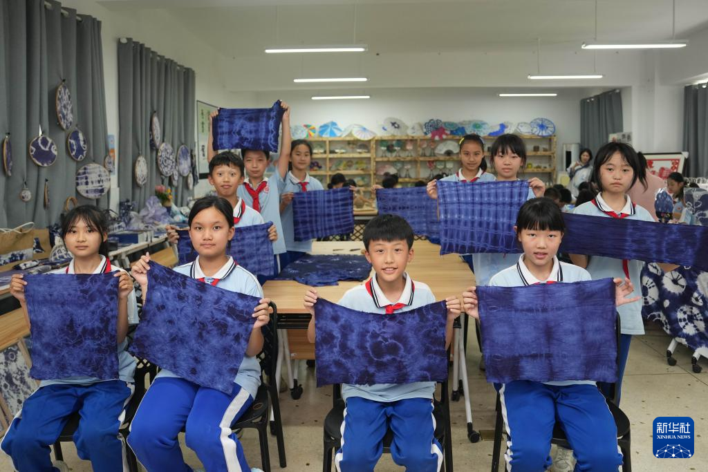 5月21日,学生们在吉首市芙蓉学校展示扎染作品。
