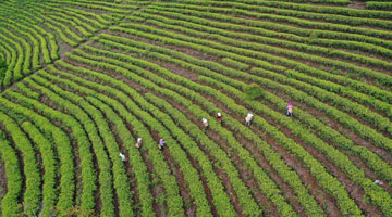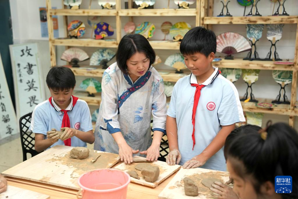 5月21日,老师(左二)在吉首市芙蓉学校指导学生制作泥塑。
