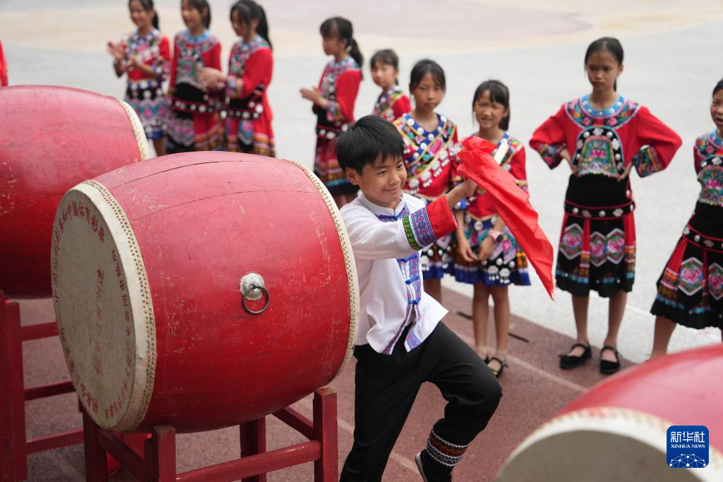 5月21日,学生在吉首市寨阳乡中心完小练习苗鼓。