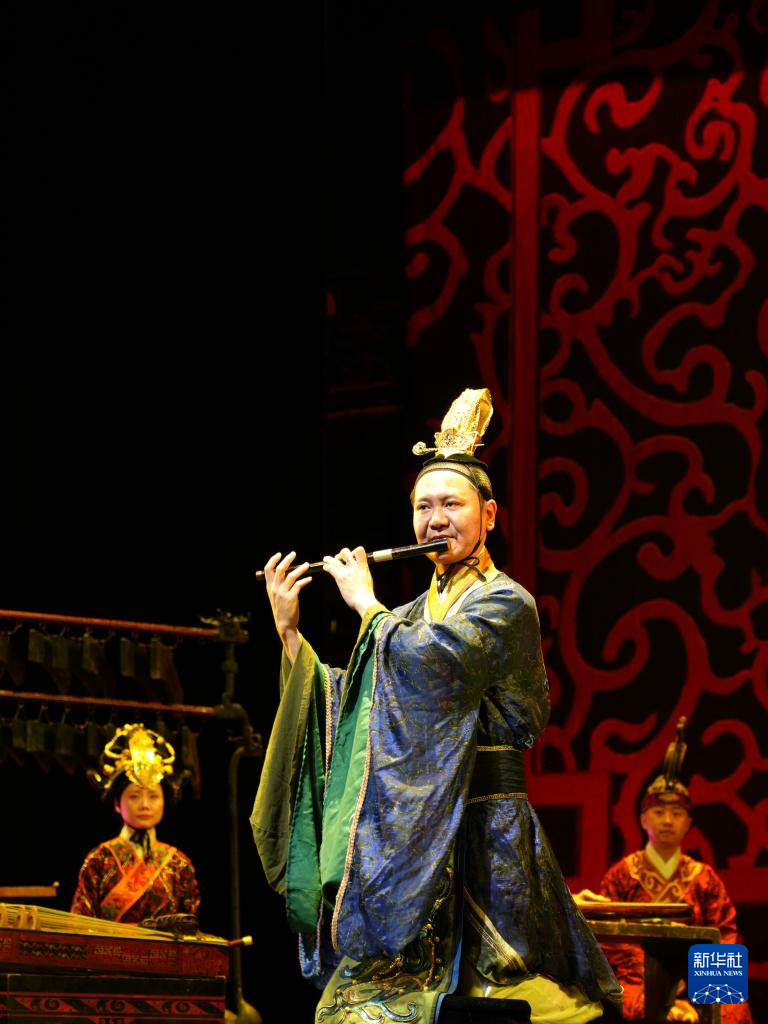 5月20日,演员在法国巴黎莫加多剧院里向观众呈现大型音乐舞蹈史诗《编钟乐舞》。新华社记者 唐霁 摄