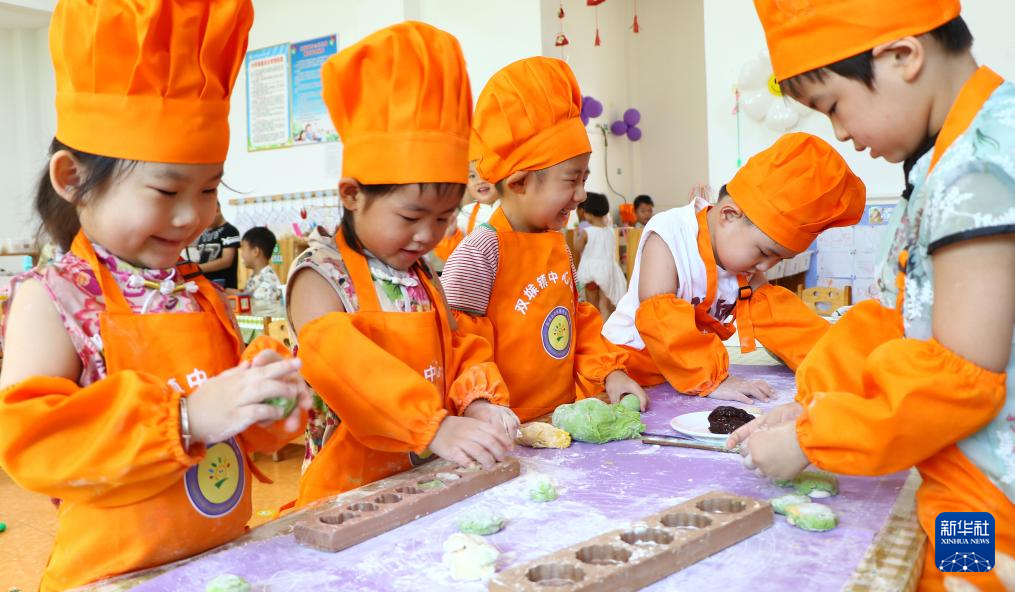 8月26日,在山东省临沂市沂南县双堠镇中心幼儿园,小朋友学做七夕巧果。