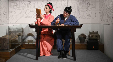 8月26日,游客在嘉兴市南湖区月河历史街区的七夕主题展板前拍照打卡。