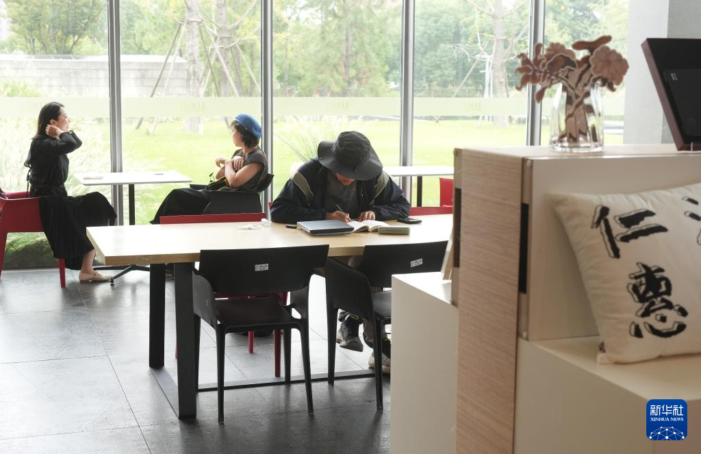 10月14日,观众在博物馆休息区学习、小憩。