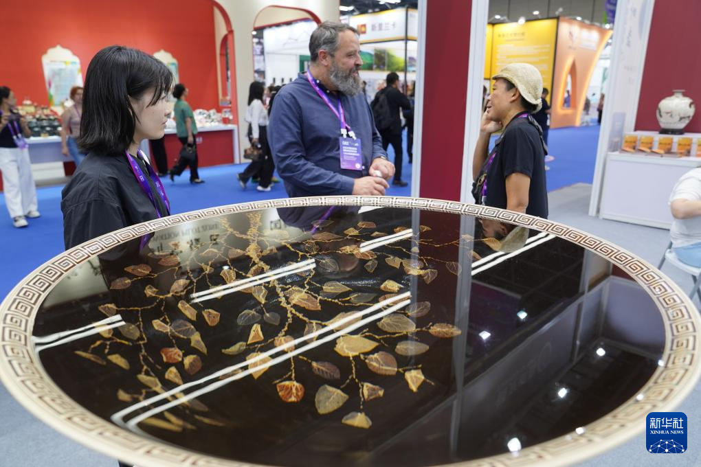 10月18日,参展商在陶瓷博览会展区观看吉州窑瓷器。