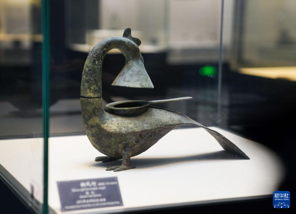 这是10月21日在广西合浦汉代文化博物馆拍摄的铜凤灯。