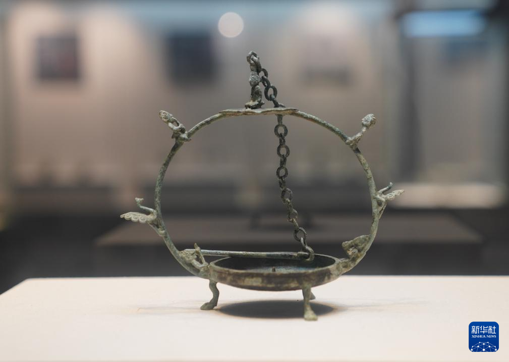 这是10月21日在广西合浦汉代文化博物馆拍摄的活链提梁铜灯。
