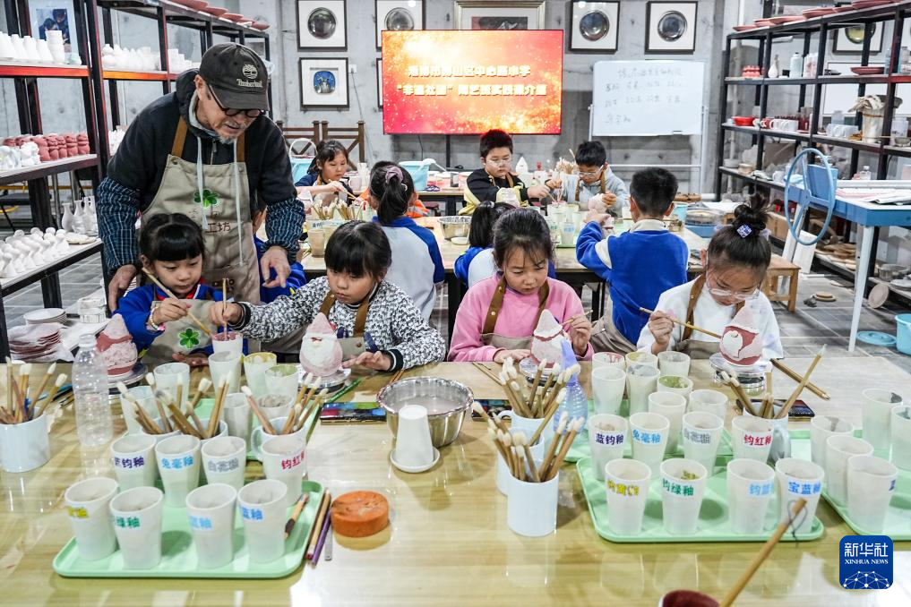 10月22日,淄博市博山区中心路小学学生在学习陶瓷制作技艺。