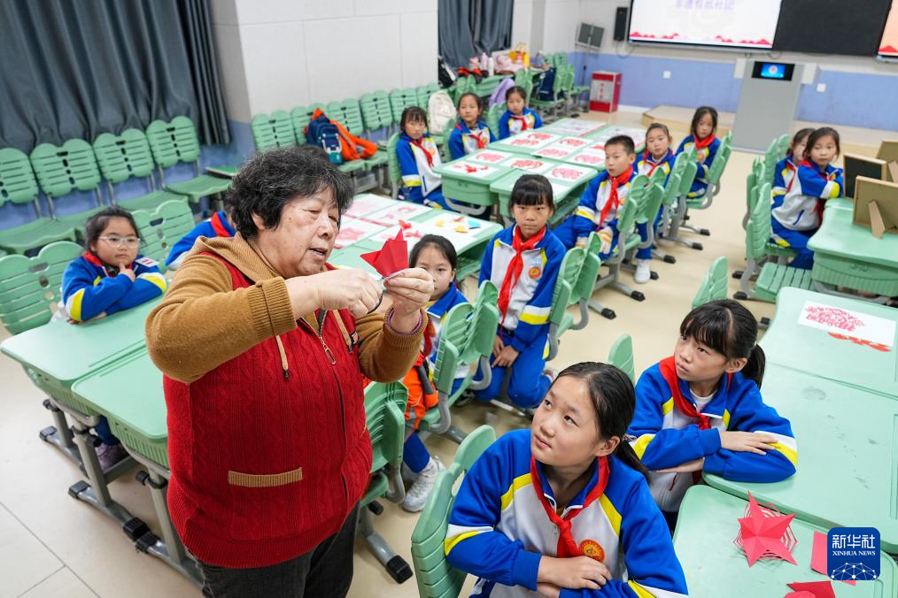 10月22日,志愿者王彬在淄博市博山区中心路小学为学生传授传统剪纸技艺。