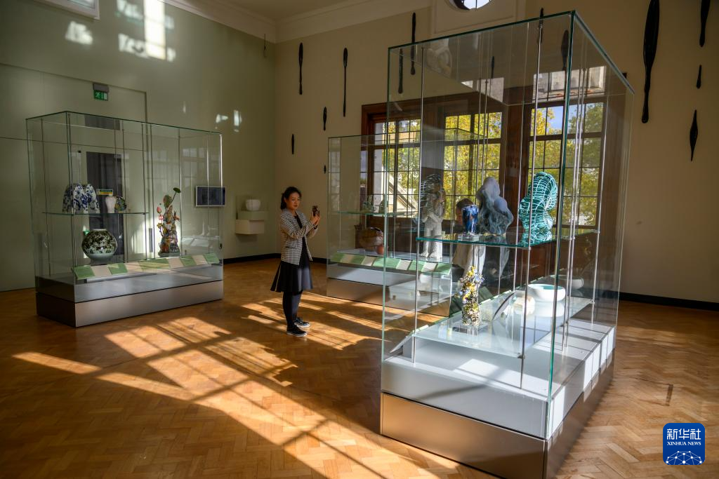 10月27日,在英国伦敦维多利亚与阿尔伯特博物馆(V&A),一名女子在《多维:中国当代工作室工艺》展览媒体预展上参观。新华社发(雷伊·唐摄)