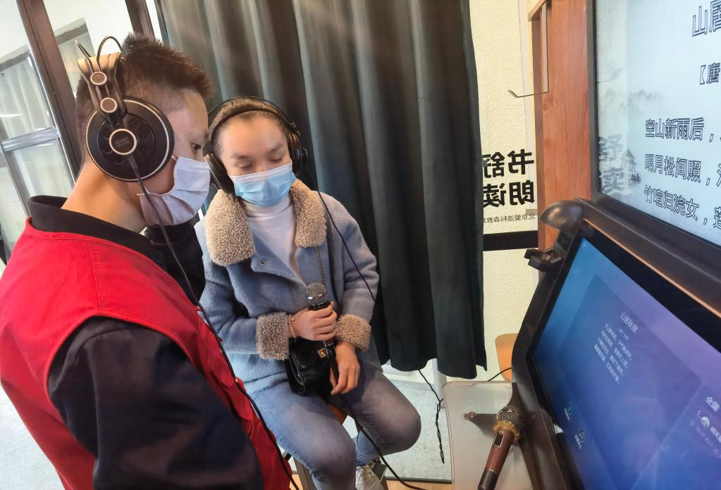 在山东省“光明之家”盲人数字图书馆,盲人读者体验“朗读亭”。(新华社记者 袁敏摄)
