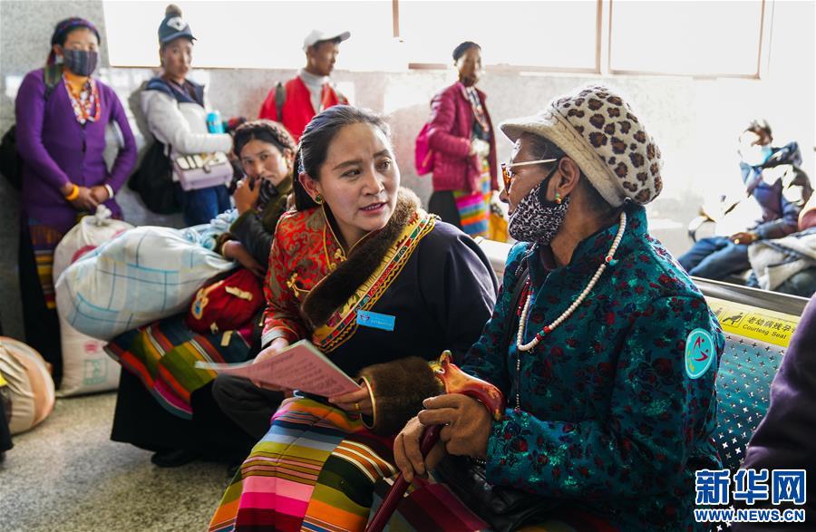 A volunteer introduces convenience service measures to a passenger at Shigatse Railway Station, southwest China’s Tibet Autonomous Region, Feb. 1, 2018. (Xinhua photo)