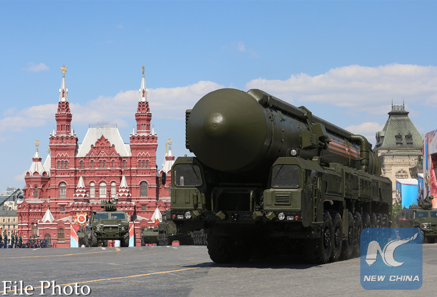 A Russian Yars intercontinental ballistic missile system drives during the Victory Day parade in Moscow May 9, 2016. (Xinhua/Bai Xueqi)