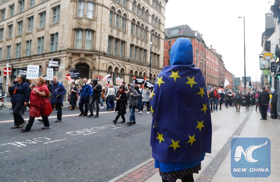 People take part in a demonstration in central Manchester, Britain, on Oct. 1, 2017, with a number of rallies organized by anti-Brexit groups and activists demanding an end to the Conservative austerity measures. (Xinhua/Han Yan)