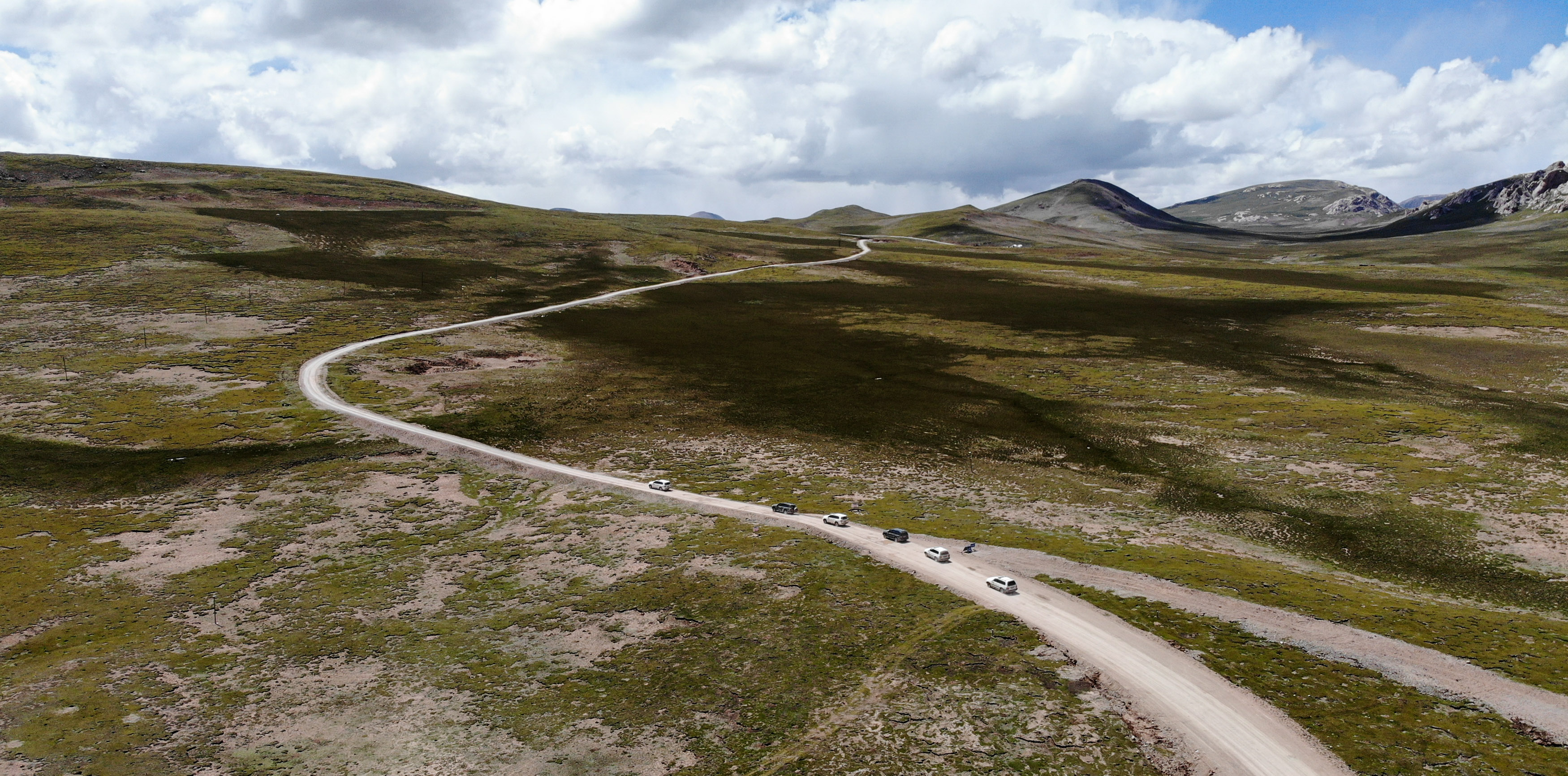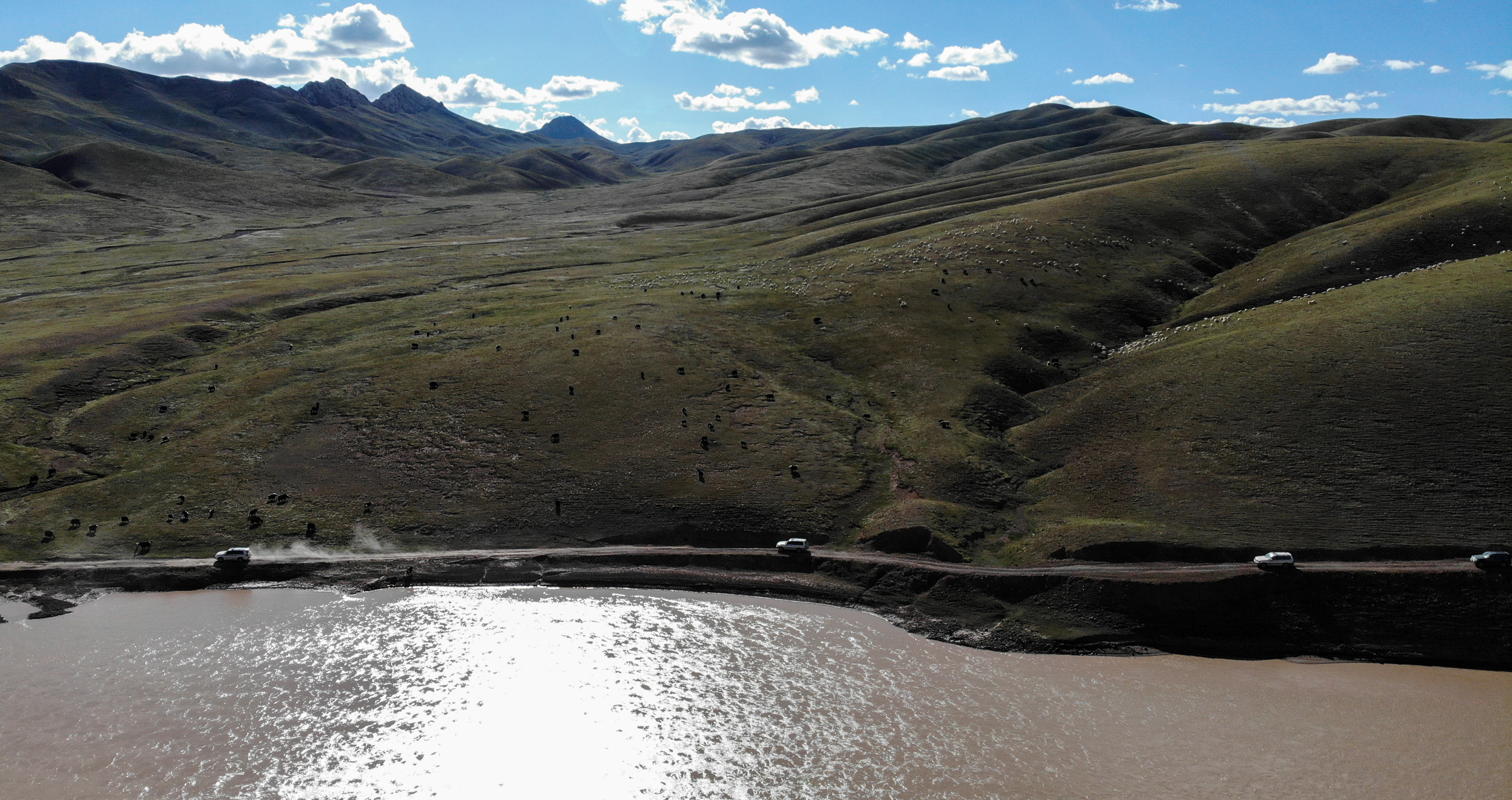 Aerial photo taken on Aug. 8, 2019 shows vehicles of the researchers of the Changjiang River Scientific Research Institute (CRSRI) running on the road in Zhidoi County, Yushu Tibetan Autonomous Prefecture, northwest China's Qinghai Province. (Xinhua/Wu Gang)