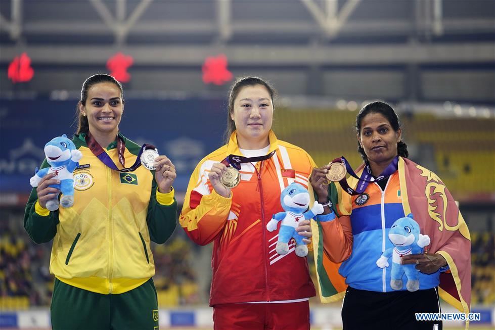 Gold medalist Zhang Li (C) of China, silver medalist Laila Ferrer (L) of Brazil and bronze medalist Liyanage N.L. Babaranda of Sri Lanka attend the awarding ceremony of the women's javelin throw final of track and field at the 7th CISM Military World Games in Wuhan, capital of central China's Hubei Province, Oct. 25, 2019. (Xinhua/Jin Liangkuai)