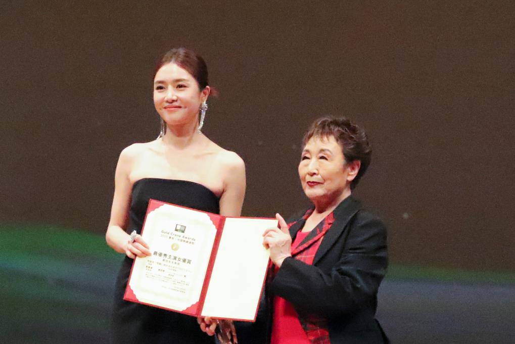 10月28日,在日本东京,演员曾梦雪(左)上台领奖。曾梦雪凭借《分手清单》荣获“金鹤奖”最佳女主角奖。新华社记者 李子越 摄