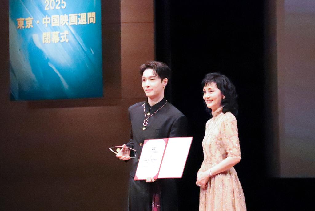 10月28日,在日本东京,演员张艺兴(左)上台领奖。张艺兴凭借《不说话的爱》荣获“金鹤奖”最佳男主角奖。新华社记者 李子越 摄