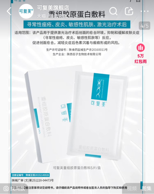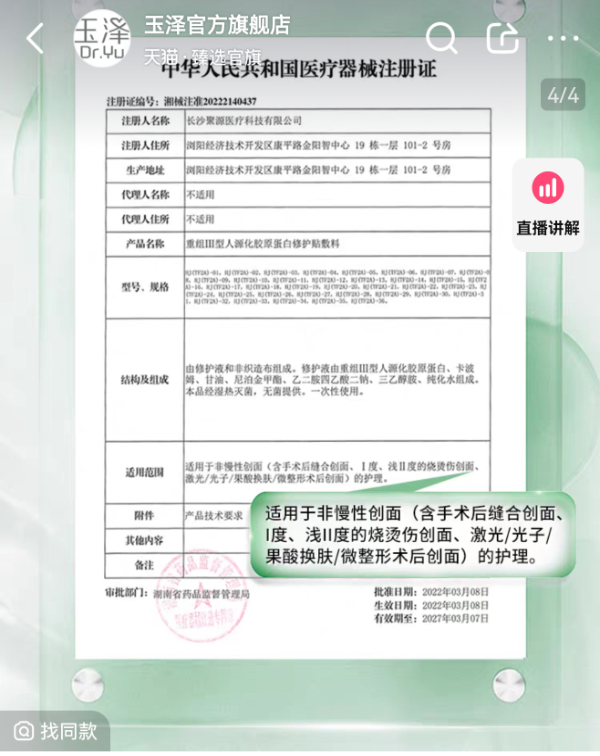 针对轻医美后引发的皮肤问题,品牌瞄准消费者需求,推出医用敷料产品。据悉,医用敷料归属二类医疗器械产品,不同于日常护肤所使用的普通面膜,需得到国家药监局的批准注册,完成管理备案。医用敷料在功效上需具有治疗和辅助治疗的作用。如可复美重组胶原蛋白敷料宣称适用于寻常性痤疮、皮炎、敏感性肌肤、激光治疗术后,玉泽重组三型人源化胶原蛋白修护贴敷料宣称适用于非慢性创面(含手术后缝合创面、一度、浅二度的烧烫伤创面、激光/光子/果酸换肤/微整形术后创面)。