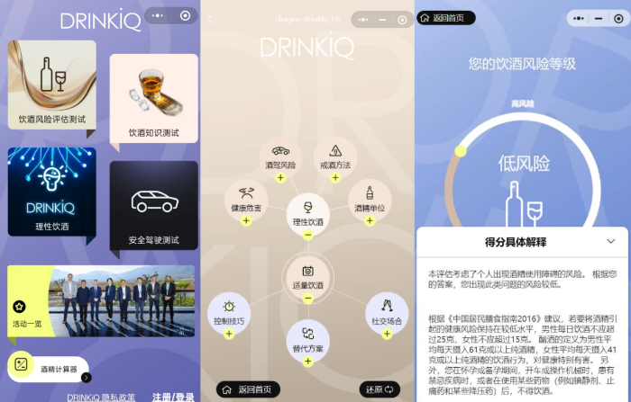 6月30日,国际烈酒集团帝亚吉欧升级的“理性饮酒DRINKiQ”微信小程序正式上线。消费者登录小程序后可以测试个人饮酒风险、了解有关酒的问题、学习“理性饮酒”知识图谱,获取针对性的“理性饮酒”方案。
