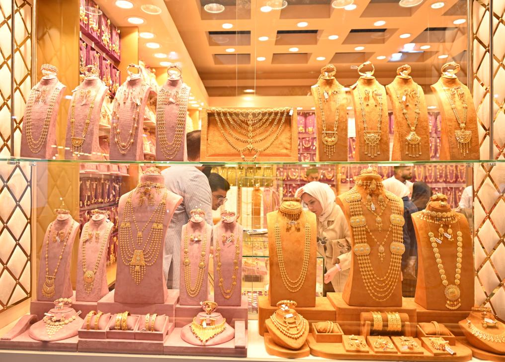 10月7日,在科威特哈瓦利省,一名男子在珠宝展上展示饰品。