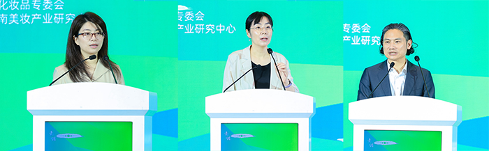 上海市经济和信息化委员会消费品和时尚产业发展处肖毓媛、上海市药品监督管理局化妆品处副处长金鑫、上海长三角一体化示范区江南美妆产业研究中心理事长雷开霆发表主题演讲