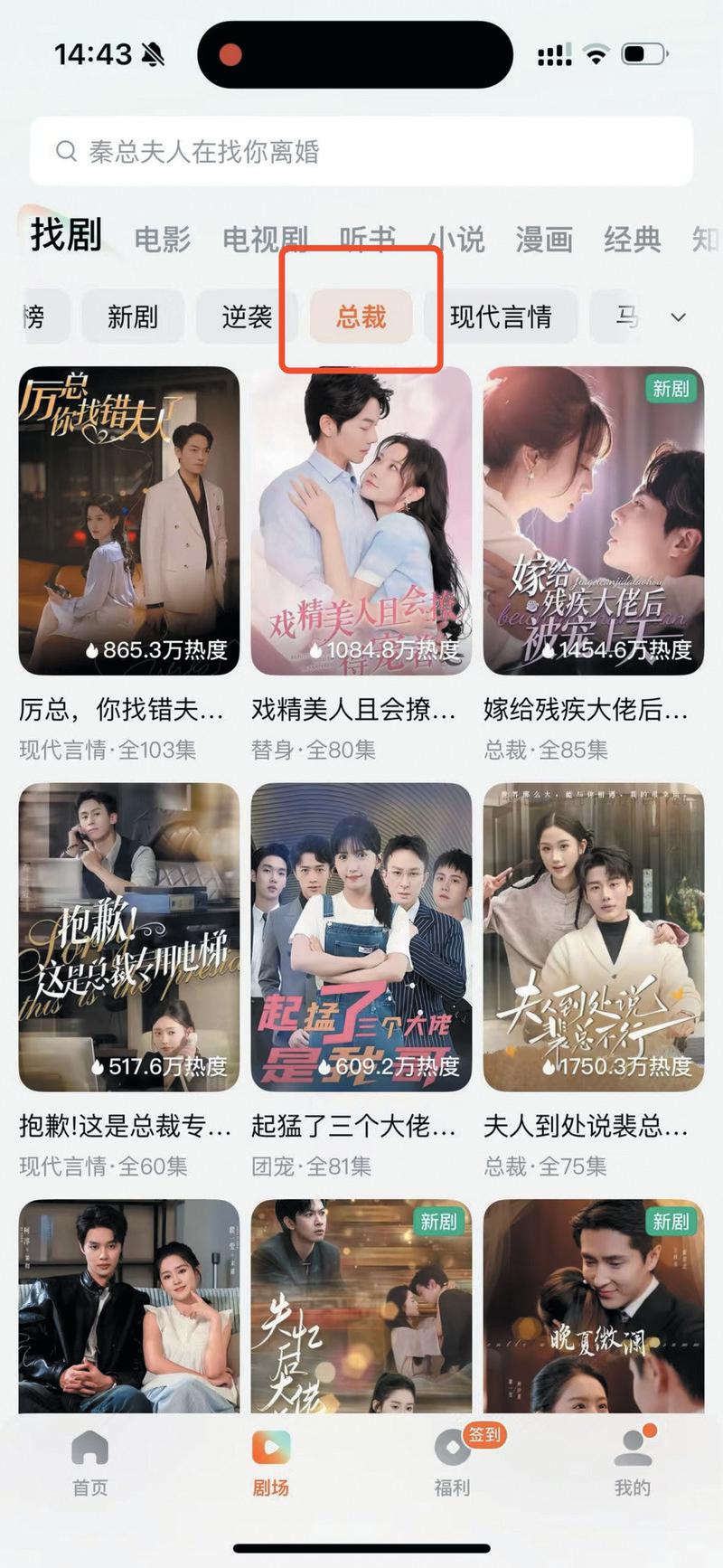 红果短剧APP(应用程序)设置“总裁”类别。 平台截图