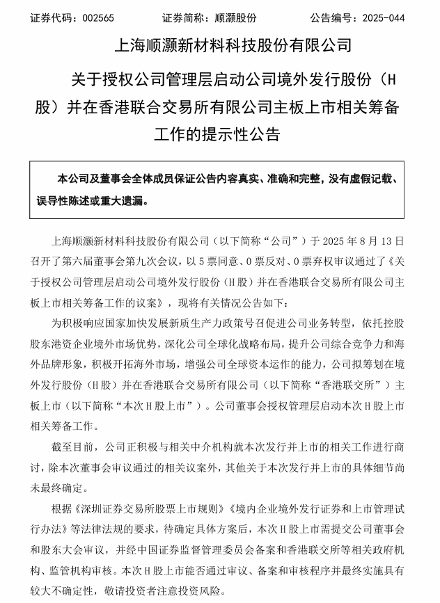 8月14日,上海顺灏新材料科技股份有限公司(以下简称“顺灏股份”)发布公告称,公司拟筹划境外发行股份(H股)并在香港联交所主板上市,以积极响应国家加快发展新质生产力政策号召,促进公司业务转型,深化全球化战略布局。