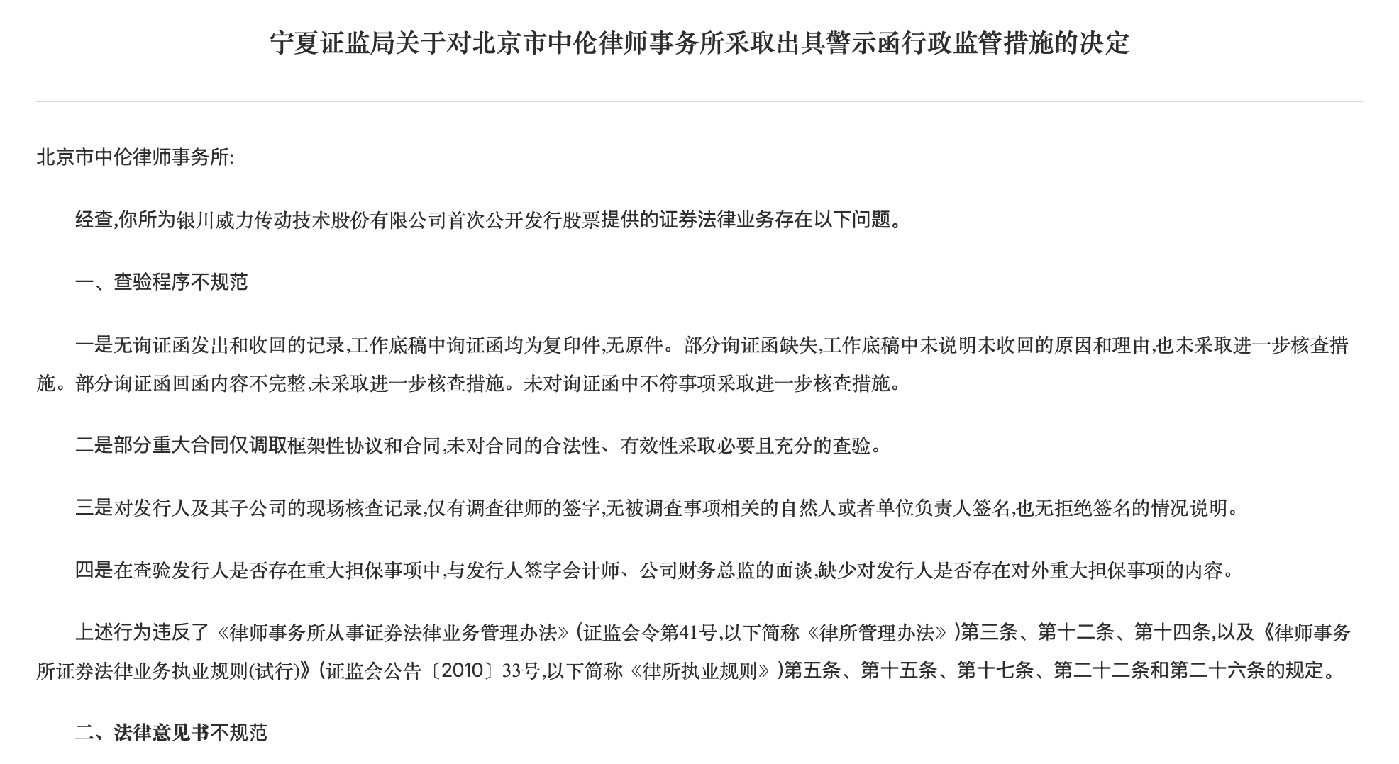 从宁夏证监局指出的问题来看,中伦律师事务所在为银川威力传动技术股份有限公司首次公开发行股票提供证券法律业务过程中不仅未对重大合同的合法性、有效性进行充分查验,就连法律意见书中常规的声明内容也出现了遗漏,作为一家专业大型律所,中伦律师事务所执业过程的严谨性、审慎态度以及内控缺失也引发广泛关注。
