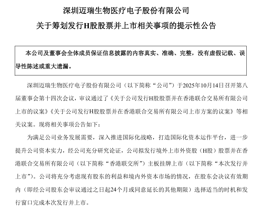10月14日晚间,迈瑞医疗公告,为满足公司业务发展需要,深入推进国际化战略,打造国际化资本运作平台,进一步提升公司资本实力,经公司充分研究论证,公司拟发行境外上市外资股(H股)股票并在香港联交所主板挂牌上市。
