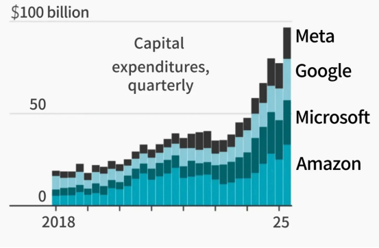 传统互联网公司以其轻资产模式和较低的边际成本著称,但自ChatGPT点燃了人工智能时代以来,科技公司很快意识到增加资本性支出的战略意义,竞相砸出重金、加大投入,资本开支呈现出了高速增长的态势。例如,美股四家科技巨头的季度资本开支由2023年年初不足400亿美元增长至2025年二季度的近1000亿美元(如下图),对AI基础设施的巨额投入正在让科技公司变得越来越“重”。