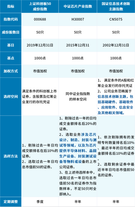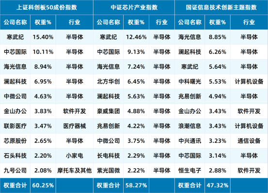 【要点:科创50指数主要成份股集中在科创龙头公司,中证芯片产业指数聚焦芯片,国证信创指数集中度较低】