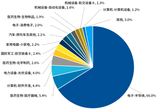 科创50指数聚焦国内最具代表性的优质科技创新龙头企业,目前覆盖了19个申万二级行业,前三大行业分别为半导体(66%)、医疗设备(5.4%)和软件开发(4.4%)。