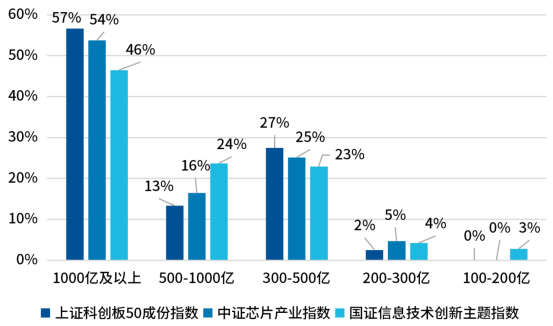 中证芯片产业指数市值平均数为886亿元、中位数为433亿元,有约54%权重的成份股市值在1000亿元以上。